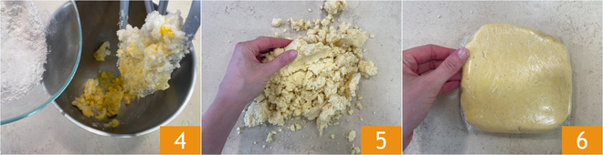 Ahora vierte la harina 4 y vuelve a encender la batidora. Cuando la harina haya sido absorbida por la mezcla, transfiérela a la superficie de trabajo y compacta para formar una masa, teniendo cuidado de no trabajarla demasiado para evitar la formación de gluten 5. Envuelve la masa en film plástico 6 y deja reposar en el frigorífico durante 30 minutos.