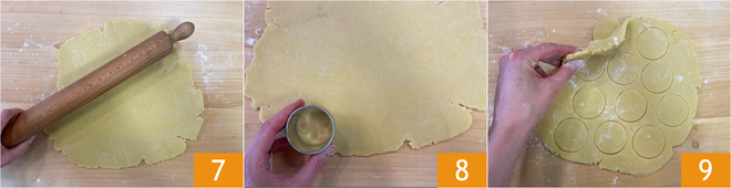 Transcurrido el tiempo de reposo, retoma la masa y, ayudándote con un poco de harina, estírala para formar una lámina de aproximadamente 0,8 cm de grosor 7. Si resultara demasiado dura, puedes ablandarla dándole golpes suaves con el rodillo. Con un cortador de galletas de 4 cm de diámetro, corta las galletas 8; obtendrás unas 40 de este tamaño. Puedes reutilizar los restos 9 amasándolos nuevamente y dejando reposar la masa en el frigorífico durante otros 30 minutos.