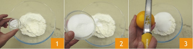 Para preparar las galletas de naranja, primero aseguraos de que todos los ingredientes estén a temperatura ambiente. En un bol, verted la harina, la levadura 1, el azúcar 2 y la ralladura de naranja 3.