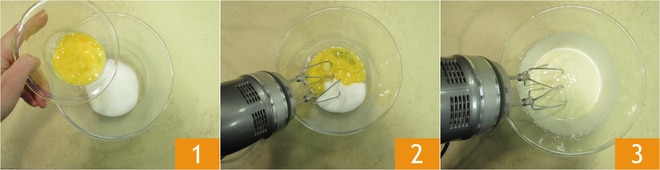 Para preparar las galletas de pistacho, derrite la mantequilla a fuego muy bajo (o en el microondas) y deja templar. Vierte en un bol el azúcar y el huevo ligeramente batido 1, mezcla con las varillas eléctricas 2 hasta obtener una mezcla espumosa 3.