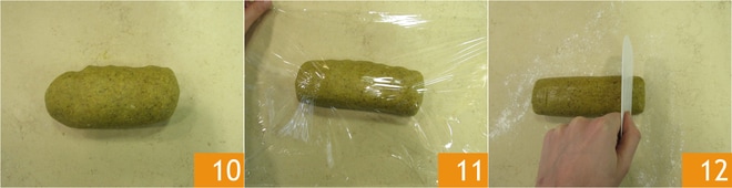 Forma un bloque 10, envuélvelo en film transparente 11 y ponlo en la nevera a reposar durante aproximadamente 1 hora. Pasado el tiempo necesario, saca la masa de la nevera y corta con un cortador de masa trozos de aproximadamente 20 g 12.