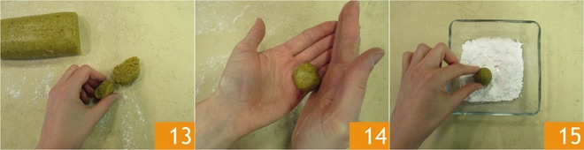 Debes obtener aproximadamente 20 piezas 13. Forma bolas con las manos 14. Pasa las bolas por azúcar glas 15 y