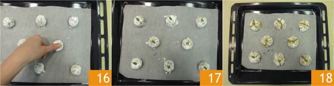 colócalas en una bandeja forrada con papel de horno. Ponlas un poco separadas porque se inflarán durante la cocción. En este punto, presiona ligeramente con los dedos sobre cada bola 16 para aplastarlas un poco. Inserta en cada galleta un pistacho entero 17 y hornea en horno estático precalentado a 180° durante 15 minutos, en la bandeja del medio del horno. Al terminar la cocción, saca las galletas de pistacho 18 y deja enfriar a temperatura ambiente antes de degustarlas.