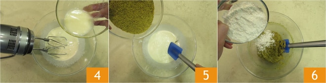 Añade la mantequilla derretida, a temperatura ambiente, manteniendo las varillas encendidas a baja velocidad 4. En este punto, añade la harina de pistacho poco a poco 5, mezclando suavemente con una espátula. Una vez que esté bien amalgamada, agrega la harina 00, la fécula 6