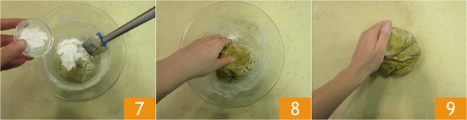 y la levadura, poco a poco, continuando mezclando con la espátula 7. Cuando la masa empiece a estar bastante sólida, comienza a trabajarla con las manos 8, trasladándola a la superficie de trabajo 9.