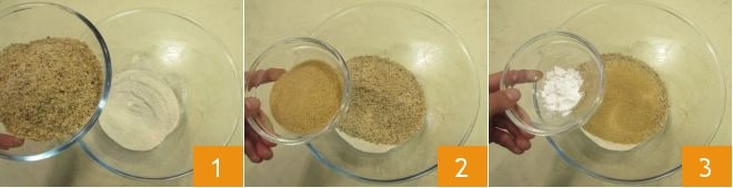 Para preparar las galletas de teff, lo primero que debes hacer es verter la leche en un cazo y calentarla sin que llegue a hervir. Mientras tanto, mezcla en un bol la harina de teff, la harina de avellana 1, el azúcar moreno 2 y la levadura en polvo 3.
