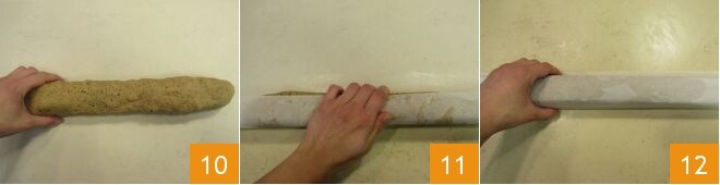 Pasado el tiempo de reposo, retoma la masa y trabájala para darle la forma de un cilindro de unos 30 cm 10. Envuelve el cilindro en un papel de horno 11, aplastando los bordes sobre la superficie de trabajo a medida que lo enrollas para darle una forma cuadrada 12. Coloca el envoltorio en el congelador para que se endurezca durante unos 20 minutos.