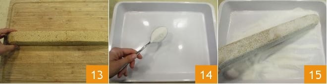 Transcurrido el tiempo de enfriamiento, retira el papel de horno 13 y espolvorea una bandeja con azúcar granulada 14, luego pasa el cilindro por el azúcar hasta cubrir uniformemente los lados 15.