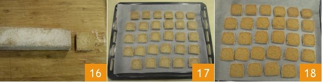 En este punto, córtalo en rodajas de 1 cm de espesor 16 y coloca los cuadraditos obtenidos en una bandeja forrada con papel de horno 17. Con estas cantidades obtendrás aproximadamente 35 galletas. Hornea las galletas en horno estático precalentado a 170° durante unos 30-35 minutos colocándolas en la bandeja del medio. Cuando estén uniformemente doradas 18, retira del horno y deja templar: ¡tus galletas de teff estarán listas para ser disfrutadas!
