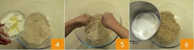 Añade la mantequilla en trozos, fría de la nevera 4, y desmenúzala en la mezcla con la punta de los dedos 5. En este punto, vierte la leche caliente 6 y mezcla brevemente para atemperar la mezcla.