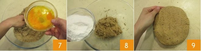 Añade los huevos batidos 7 y amasa con las manos para incorporarlos al resto de los ingredientes. Antes de que la mezcla quede completamente homogénea, añade también la harina de arroz 8 y termina de amasar hasta obtener una masa de consistencia uniforme 9. Envuelve la masa en film transparente y déjala reposar en el frigorífico durante al menos 30 minutos.