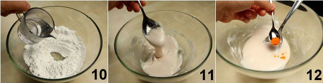 Preparad mientras tanto el glaseado mezclando en un bol el azúcar glas y un poco de agua hirviendo 10 de a poco hasta obtener una crema bastante densa 11, (podéis corregir la consistencia del glaseado añadiendo más azúcar glas o agua según sea necesario).