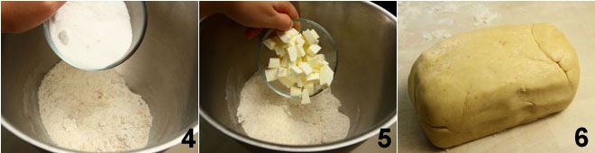 y añadid también el azúcar 4 y la mantequilla fría 6 en cubos; amasad rápidamente hasta obtener una mezcla arenosa, en este punto, añadid también el huevo entero y la yema; formad un bloque 6, cubridlo con film plástico y metedlo en la nevera a reposar al menos 1 hora.