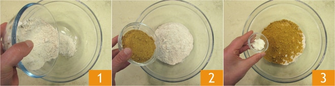 Para preparar las galletas integrales sin mantequilla, pon en un bol todos los ingredientes secos: la harina integral de espelta 1, el azúcar moreno 2 y el bicarbonato de amonio para repostería 3.