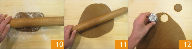 Transcurrido el tiempo de reposo de la masa, extiende la masa con un poco de harina de espelta 10 hasta un grosor de 5 mm 11. Corta con la forma que hayas elegido: nosotros usamos un cortador de budín de 5,5 cm de diámetro 12. Trabaja el sobrante de masa para formar más galletas, con estas cantidades obtendrás 30 piezas.