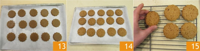 Coloca las galletas, bien separadas, en una bandeja de horno forrada con papel vegetal 13. Hornea en un horno estático precalentado durante 20 minutos a 175 °C. Transcurrido el tiempo de cocción, traslada las galletas integrales sin mantequilla a una rejilla y deja enfriar 15.