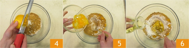 Ralla la cáscara de una naranja 4, añade los huevos batidos mientras mezclas con el tenedor 5. Vierte también el aceite de arroz en hilo 6.