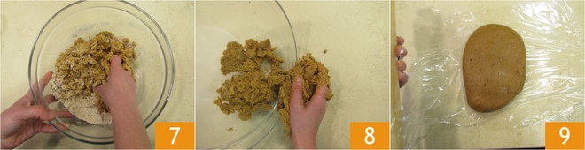 Puedes empezar a amasar a mano 7. Cuando los polvos hayan absorbido los líquidos, pasa todo a la superficie de trabajo 8. Sin añadir harina ni grasas, amasa hasta obtener una masa compacta. Forma un bloque y ponlo en la nevera cubierto con film 9, durante al menos 30 minutos.
