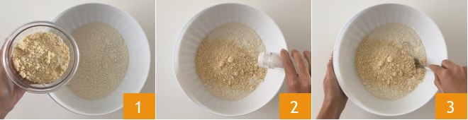 Añade el aceite de semillas 4 y el de oliva 5 y mezcla de nuevo con el tenedor para obtener una mezcla arenosa 6.