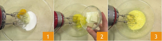 Para realizar las galletas thumbprint lo primero que debéis hacer es verter en un bol el azúcar y el huevo 1 y batir con las varillas eléctricas. Añadid la mantequilla ablandada 2 y cuando obtengáis una mezcla homogénea 3