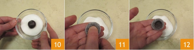 Revestid cada bolita con el azúcar 10, luego haced una ligera presión en el centro con el pulgar 11 para crear un hueco 12.