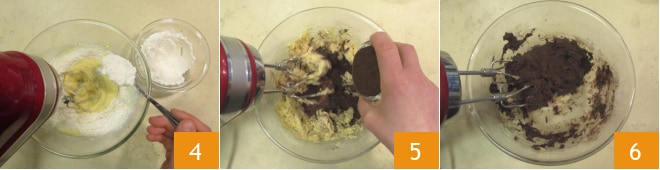 incorporad la harina una cucharada a la vez 4 y, siempre mezclando con las varillas, añadid también el cacao 5. La mezcla quedará bastante compacta 6, podéis continuar trabajando con las varillas o a mano en el bol.