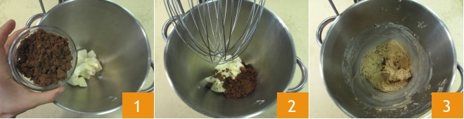 Para realizar las galletitas de cacao sin huevos, echad en un robot de cocina equipado con batidor la mantequilla a temperatura ambiente y el azúcar muscovado 1. Poned la máquina en marcha 2 y trabajad todo hasta obtener una mezcla homogénea 3.