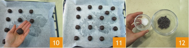 Tomad aproximadamente 16/18 gramos de masa, haced bolas con las manos 10, trabajándolas rápidamente para no calentar demasiado la masa, y colocadlas en una bandeja forrada con papel de horno 11, obtendréis unas 35 galletitas. En un bol pequeño mezclad las gotas de chocolate con los copos de sal 12.