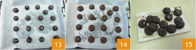 Decorad la superficie de las galletitas con el chocolate y la flor de sal 13. Coced en horno estático precalentado a 180 grados durante unos 18 minutos. Una vez cocidas, sacad las galletitas de cacao sin huevos del horno 14 y dejadlas templar antes de disfrutarlas 15.