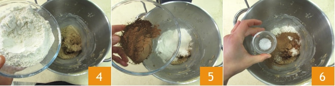 Incorporad la harina 4, el cacao 5 y los copos de sal.