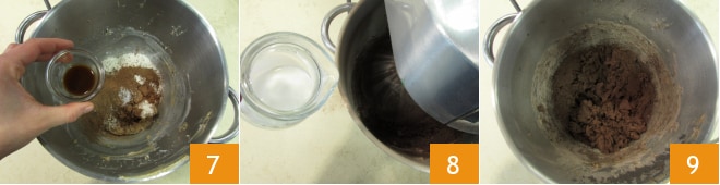 Aromatizad con el extracto de vainilla 7 y mezclad nuevamente con las varillas. Mientras el robot de cocina está en funcionamiento, verted la leche en hilo 8 y continuad hasta que se absorba 9.