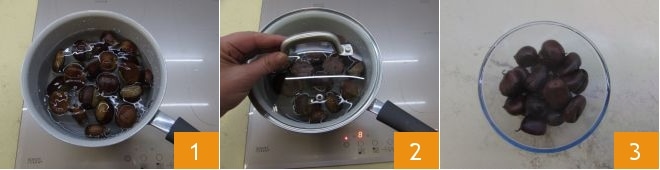 Para preparar la gallina de Guinea rellena de castañas con salsa de granada, empezad por hervir las castañas. Vertedlas en una cacerola llena de agua 1, cubridlas con una tapa 2 y dejadlas cocer durante unos 30 minutos. Una vez transcurrido este tiempo, haced la prueba con un palillo: pinchadlas para verificar que estén cocidas y, en tal caso, escurridlas. Reservadlas en un cuenco 3, cubridlas y dejadlas templar; de este modo, la capa exterior se ablandará y será más fácil pelarlas.