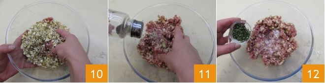 Amasad todo con las manos 10 y ajustad de sal y pimienta 11. Picad finamente el romero y añadidlo a la mezcla 12.