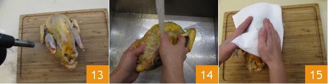 Reservad el relleno durante unos minutos y ocupaos de la gallina de Guinea. Pasad la gallina de Guinea por la llama para eliminar posibles plumas 13, nosotros hemos utilizado un soplete, pero en su ausencia podéis acercar la gallina de Guinea durante unos segundos a la llama del gas. Luego, enjuagadla bajo agua corriente 14 y secadla con papel absorbente 15.