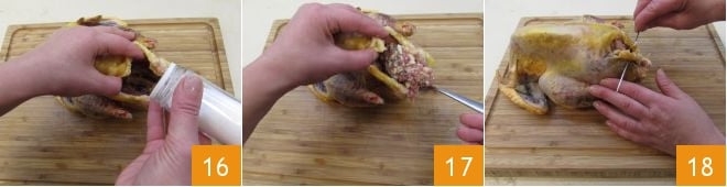Salad y pimentad el interior de la gallina de Guinea 16 y con la ayuda de una cuchara, rellenadla con el relleno de salchicha y castañas 17. Cosed la apertura externa 18, utilizando una aguja de cocina o la aguja más gruesa que tengáis y cordel. De este modo la cerraréis completamente y evitaréis que el relleno se salga durante la cocción.