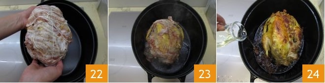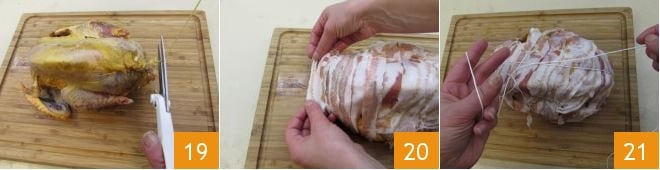Luego, cortad la parte final del cordel 19 y cubrid la gallina de Guinea con la panceta 20. Por último, enrollad todo con cordel 21, como si fuera un asado, para fijar la panceta.