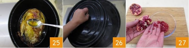 y continuad la cocción durante otros 90 minutos, bañándola de vez en cuando con su jugo 25 y cubriéndola con una tapa 26. Cuando la gallina de Guinea esté casi cocida, ocupaos de preparar la salsa de acompañamiento. Dividid la granada a la mitad y empezad a desgranar los granos 27, reservando los granos.