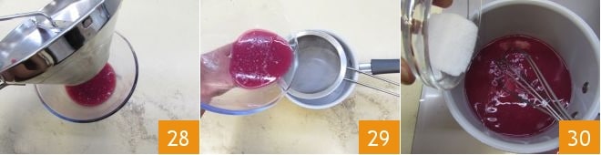 Obtained 280 g y transferidlos dentro de un pasapuré y extraed solo el jugo 28, luego vertedlo dentro de una cacerola filtrándolo 29 y añadid el azúcar 30. Mezclad todo y coced durante 5-6 minutos.