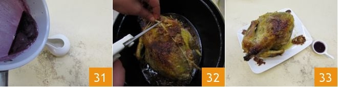 Una vez obtenida una salsa bastante densa, vertedla dentro de una salsera 31 y retomad la gallina de Guinea ya cocida. Eliminad el cordel exterior, cortándolo con las tijeras 32 y servid vuestra gallina de Guinea rellena de castañas aún caliente, acompañándola con la salsa de granada 33.