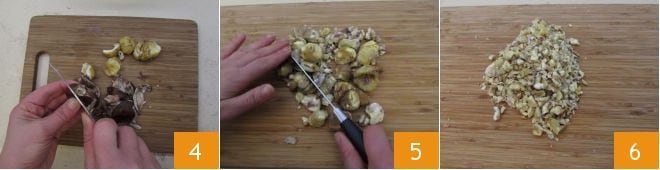 Una vez frías, pelad las castañas 4, debéis obtener 400 g de castañas limpias, luego con un cuchillo picadlas 5 groseramente 6.