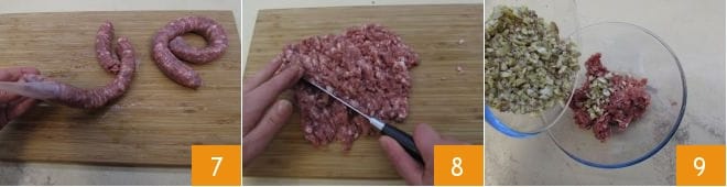 En este punto, tomad la salchicha y quitadle la tripa exterior 7, para hacerlo bastará con hacer un corte en el centro de cada salchicha y deslizarlo delicadamente con las manos. Picad también esto groseramente 8 y trasladadlo a un cuenco junto con las castañas 9.