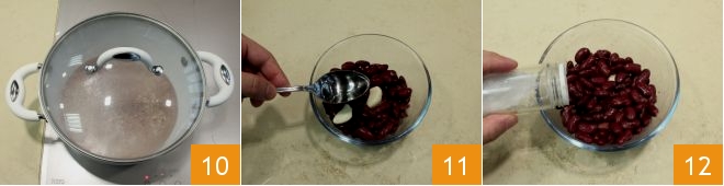 Cubre y deja cocinar a fuego muy bajo durante al menos 15-20 minutos 10. En un tazón, sazona los frijoles con el ajo, una cucharadita de aceite de semillas y la sal (11-12).