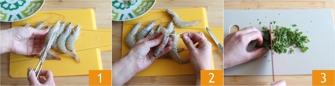 Para preparar las gambas en sartén, comienza por limpiar las gambas: corta las patas con unas tijeras 1, luego con cuidado elimina el caparazón dejando adherida la cola y la cabeza de la gamba. Con un palillo extrae el hilo negro, el intestino 2. Lava y pica con un cuchillo un manojo de perejil y reserva 3.