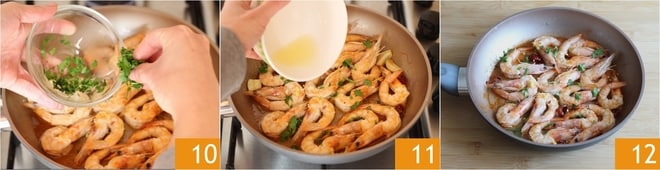Sazona con una pizca de sal, el perejil picado 10 y el jugo de limón 11, cocina por un par de minutos más. Sirve las gambas calientes en sartén 12.