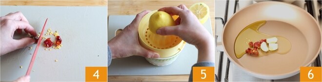 Corta el chile en rodajas 4, puedes decidir si dejar o no las semillas. Exprime el jugo de un limón 5. Ahora calienta el aceite en la sartén, luego sofríe el ajo pelado y el chile 6.