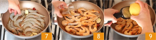 Después de unos instantes, coloca las gambas en la sartén 7 y cocínalas 2 minutos por cada lado, a fuego alto. Desglasa con el brandy 8, inclina ligeramente la sartén y deja flambear hasta que la llama se apague por sí sola. Añade la ralladura de limón 9.