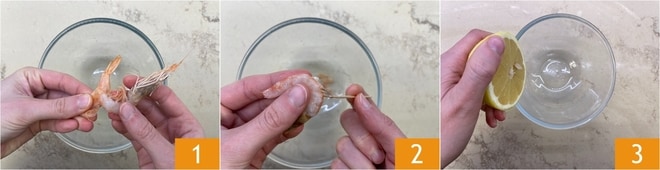 Para preparar las gambas marinadas a la plancha, comenzad limpiando las gambas: eliminad la cola y el caparazón, manteniendo la cabeza 1. Extraed con un palillo el filamento en el dorso 2 y reservad. Ocupaos de la marinada de las gambas: en un bol, exprimid el zumo de limón, bastará con una cucharada 3.