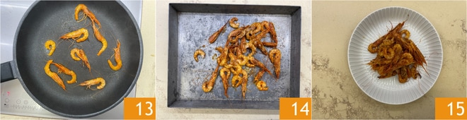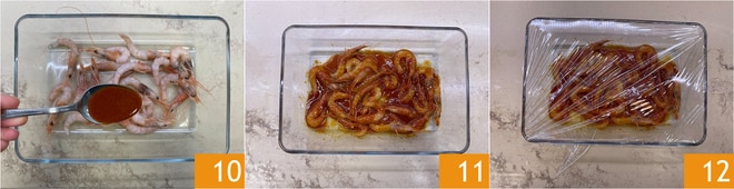 Verted la marinada sobre las gambas limpias 10, de modo que queden completamente cubiertas 11, luego envolved la bandeja con film y dejad reposar en la nevera durante 30 minutos.