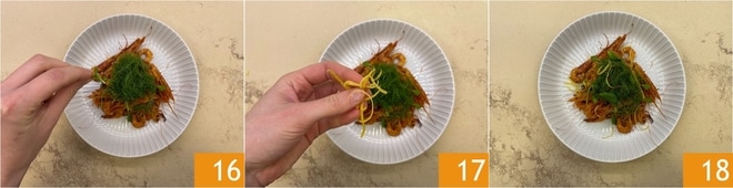 Completad con la mezcla de hierbas aromáticas: eneldo, hinojo y menta 16 y ralladura de limón 17. Las gambas marinadas a la plancha están listas para degustar 18.