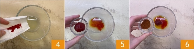 Añadid el azafrán 4, el concentrado de tomate 5 y el pimentón 6.